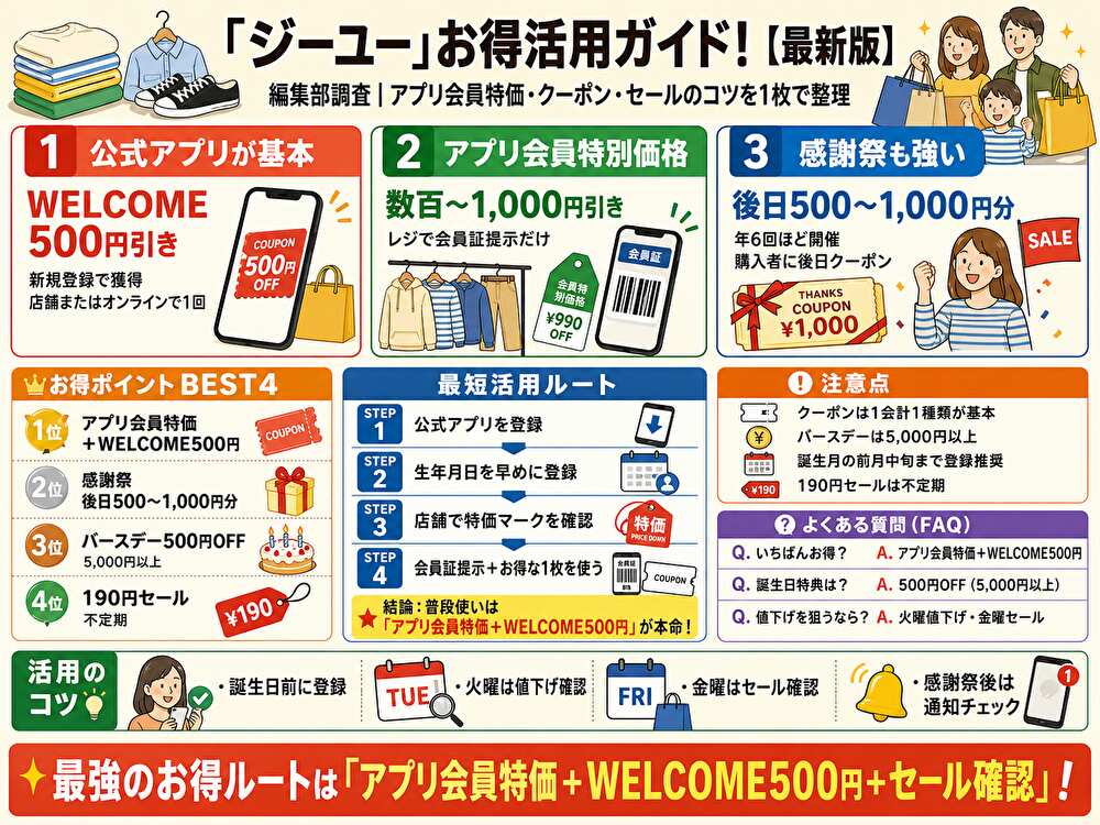 - 結論:GU最強のお得ワザは公式アプリの「アプリ会員特別価格」+「WELCOMEクーポン500円引き」の組み合わせ!両方とも会員証提示だけで簡単に適用されます。